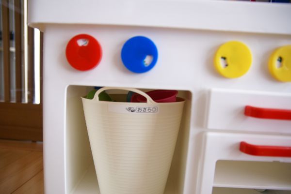端切れ布をかぶせてある部分は、良く使う遊び道具を少し入れてあります。
