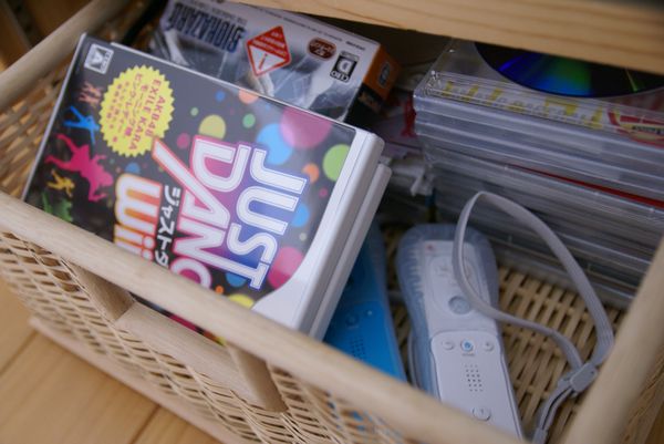 ソフトやコントローラーは、その下の無印のかごの中に“とりあえず”収納されています。