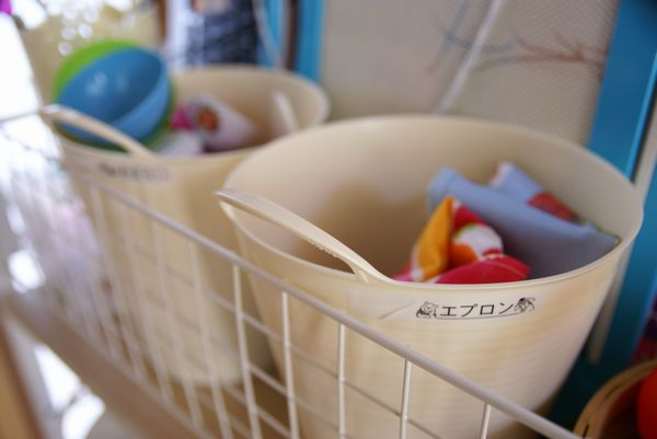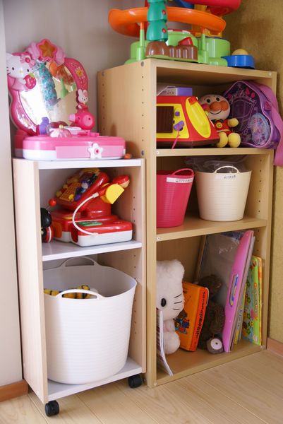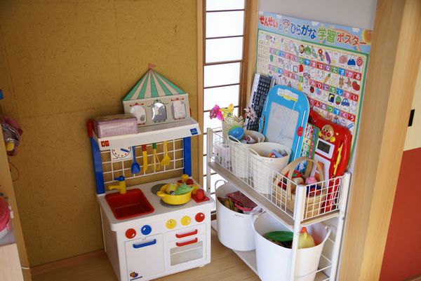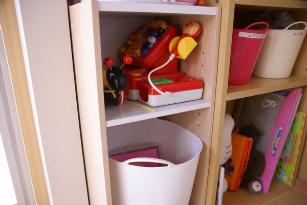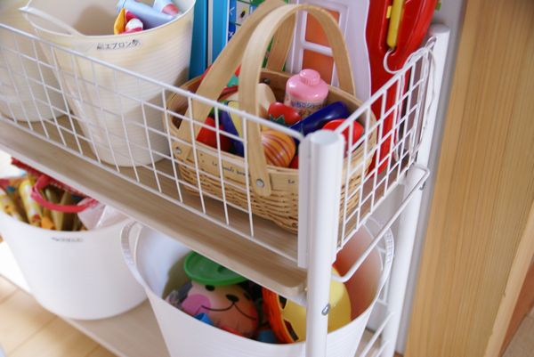 キッチンの隣に置いたのは、おままごとで遊ぶための物(食器関係、エプロン、食材等)を置くため。