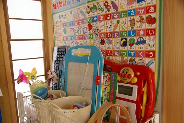 アンパンマンのひらがな練習やキーボードなどもここに立てかけました。