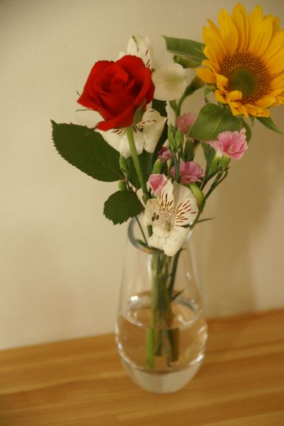 今までも、一輪挿しに入る程度(本当、1本とかの世界です)の花を時々買ったり、くうがとってくれたタンポポなど(笑)入れていたんですが